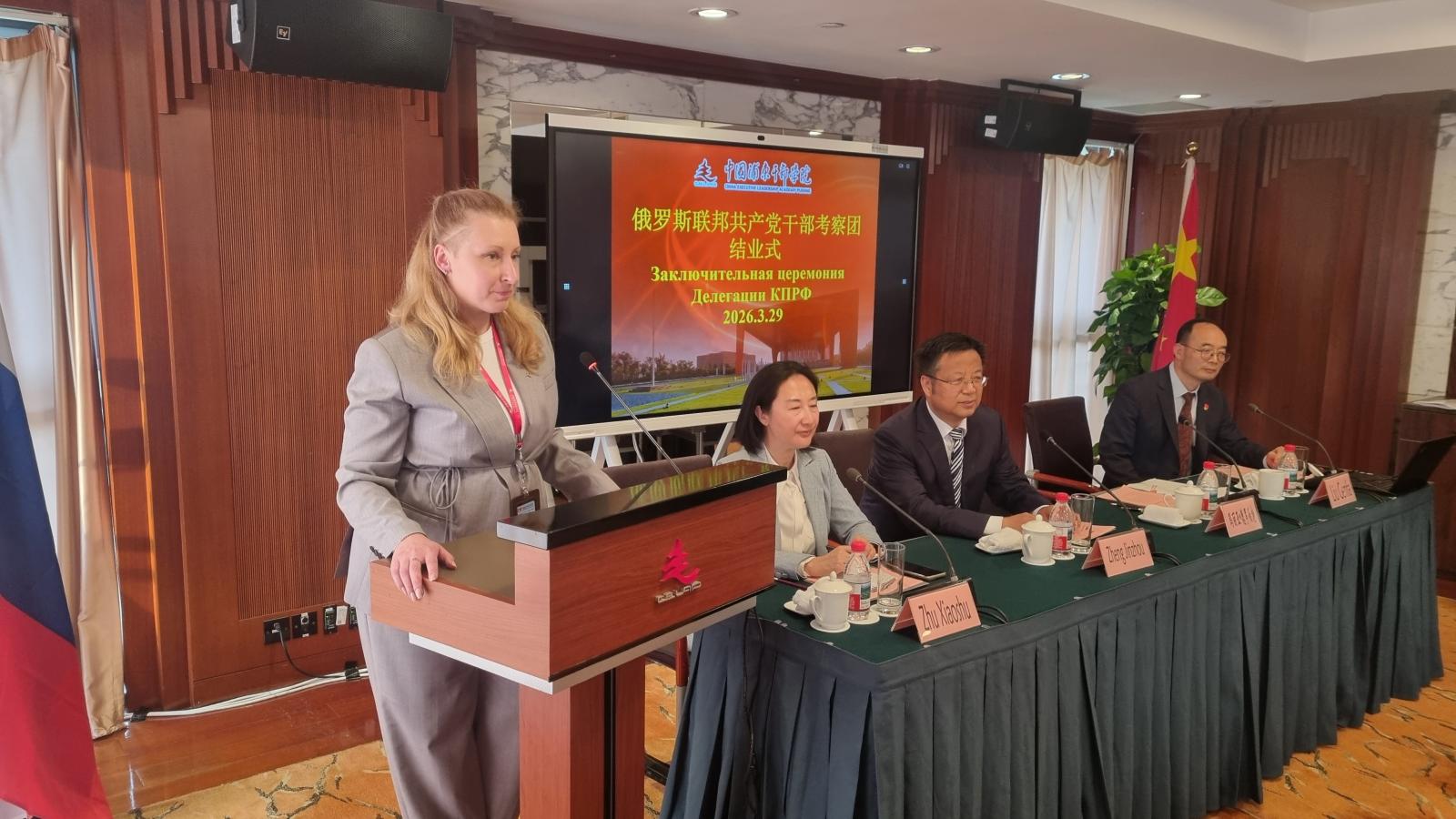 С заключительным словом выступила руководитель делегации Мария Дробот. Член Президиума, секретарь ЦК КПРФ отметила, что визит позволил делегации системно ознакомиться с китайской моделью развития от идеологических основ до практики управления на местах. Она подчеркнула, что особый интерес для партии представляет сочетание стратегического планирования, подготовки кадров и социальной политики, обеспечивающее устойчивое развитие страны.